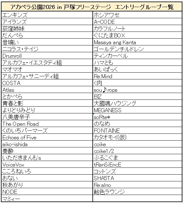 現時点で確認がとれているエントリーグループ一覧を公表いたします。応募したのに名前がないというグループはお手数ですがご連絡をお願いします。acaparktotsuka@gmail.com